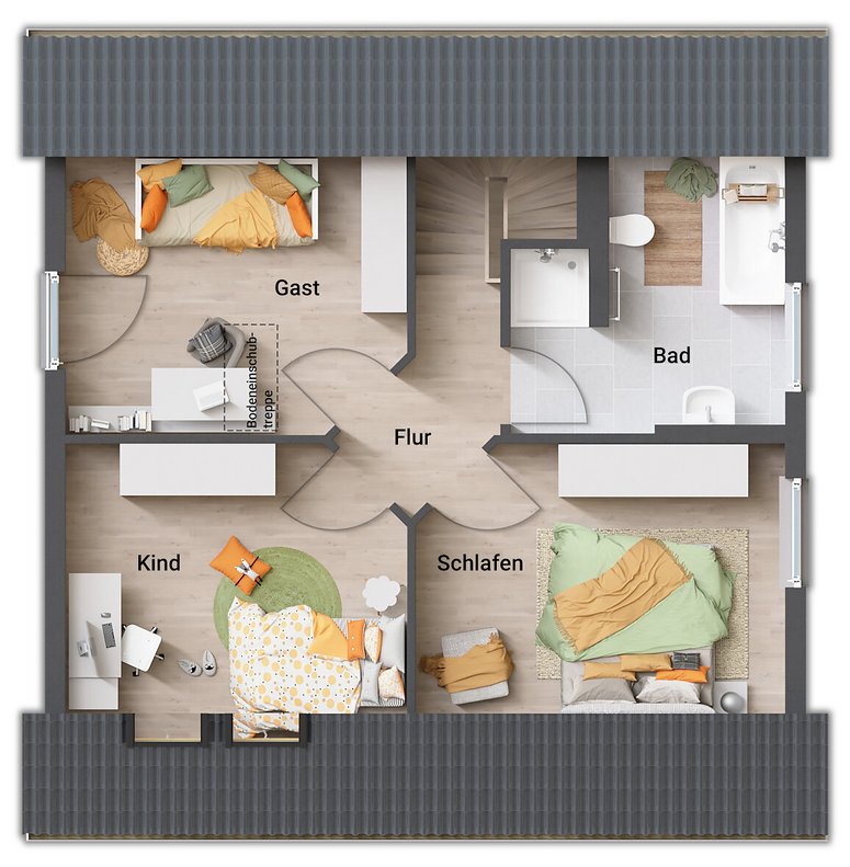 0er Dachüberstand: Es scheint: Je weniger Dachüberstand, desto moderner. Auch beim Raumwunder 100 Novo sorgt der 0er Dachüberstand für ein optisches Highlight: weg vom altbackenen Aussehen eines Einfamilienhauses – hin zu einem frischem, modernem Traumhaus für dich und deine Familie.