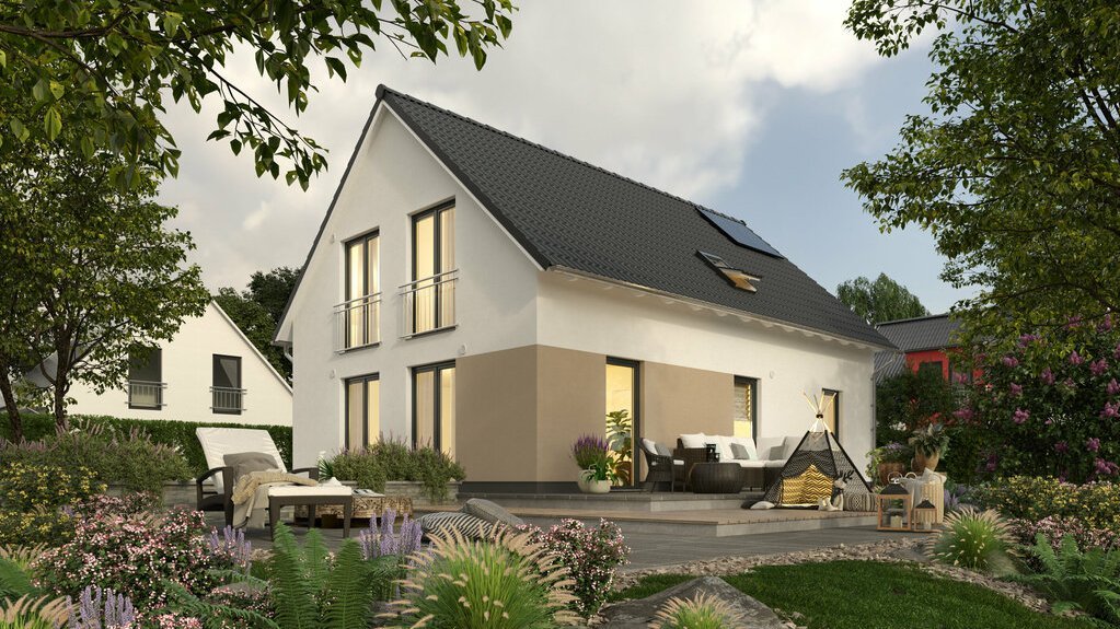 Mit dem Haus des Monats können Sie sich über das beliebte Satteldach, eine großzügige Raumgestaltung und einen flexiblen Grundriss freuen. Unser Bodensee 129 lädt Familien auf rund 128 Quadratmetern zum Wohlfühlen ein.